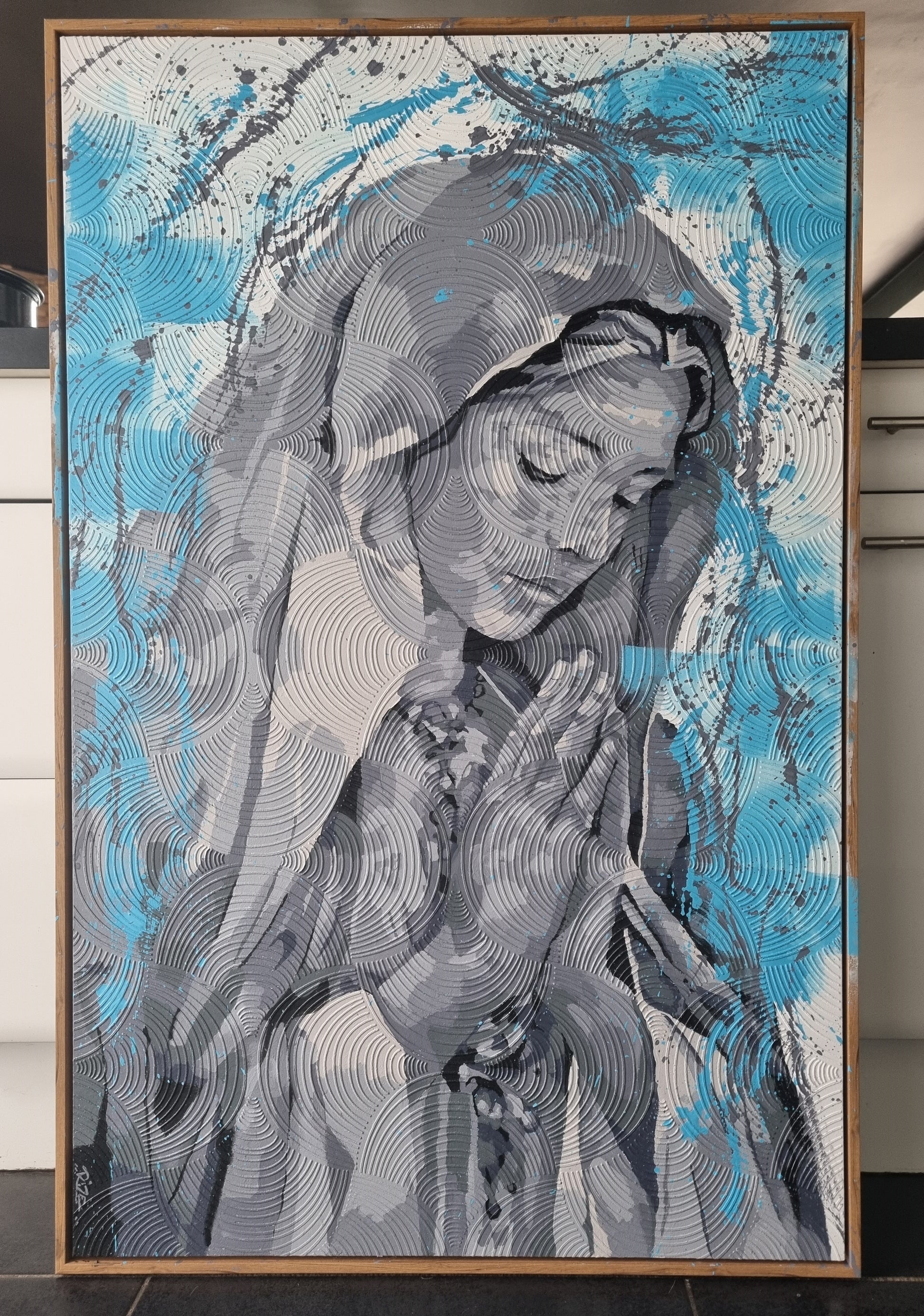 Cette peinture contemporaine réalisée par Monsieur Rize représente une figure religieuse féminine, identifiable comme la Vierge Marie.